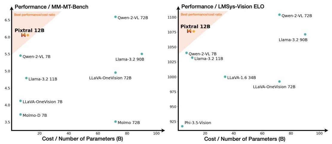 "summary": "The image consists of two scatter plots comparing various models on two different performance metrics against their cost or number of parameters. The left plot shows performance on the MM-MT-Bench, while the right plot shows performance on the LMSys-Vision ELO. Each point represents a different model, with the x-axis indicating the cost or number of parameters in billions (B) and the y-axis indicating the performance score. The shaded region in both plots highlights the best performance/cost ratio, with Pixtral 12B positioned within this region in both plots, suggesting it offers a strong balance of performance and cost efficiency. Other models like Qwen-2-VL 72B and Qwen-2-VL 7B also show high performance but at varying costs."