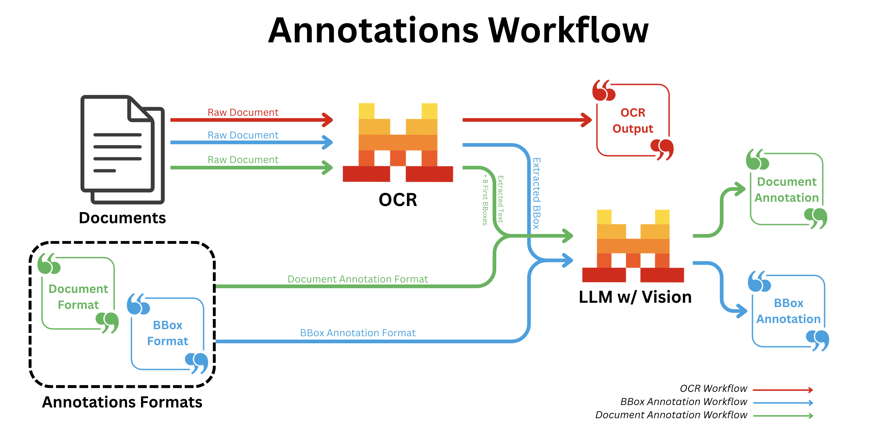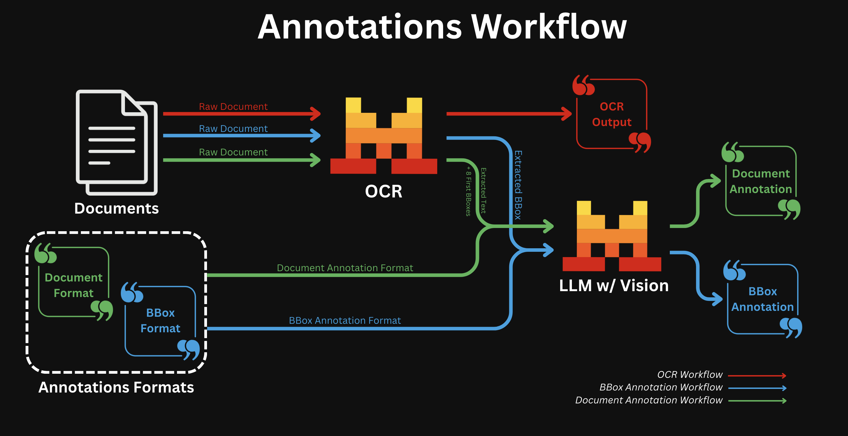 - After regular OCR is finished; we call a Vision capable LLM for all bboxes individually with the provided annotation format.