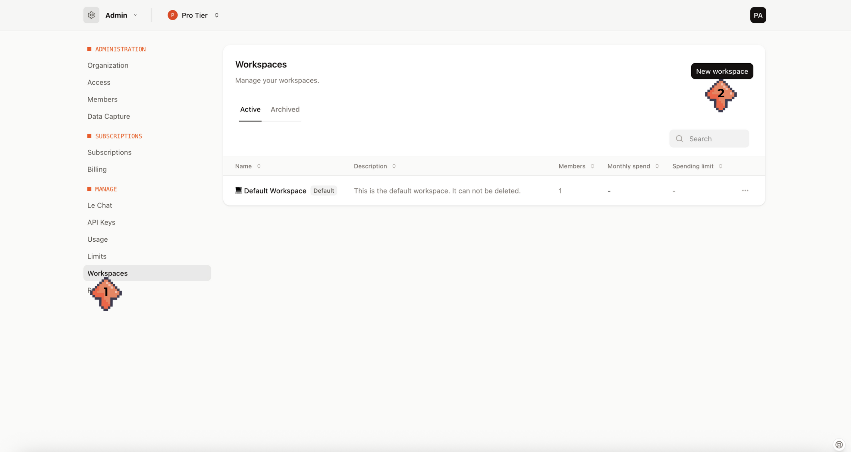 On the other hand, only certain members with sufficient permissions are allowed to create Workspaces and manage them. If you have such permissions, you can create a workspace as indicated below by visiting the Admin page or following the previous step (2). Under Workspaces (1), click "New Workspace" (2).