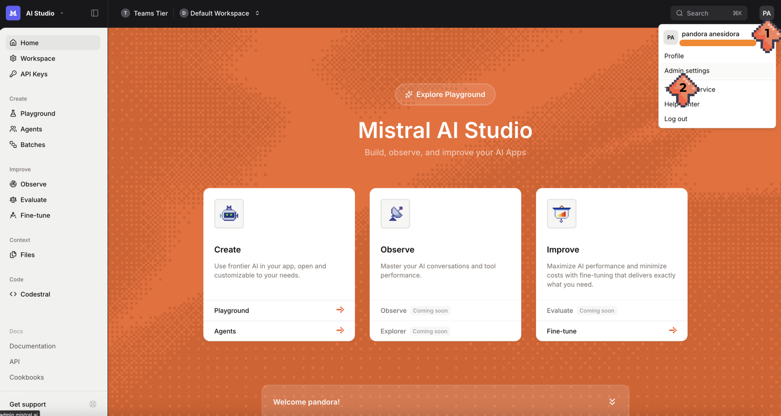 A Mistral AI Studio Workspace is a group of accounts within the same organization, each with specific rights and permissions. Creating a workspace for your team allows you to: