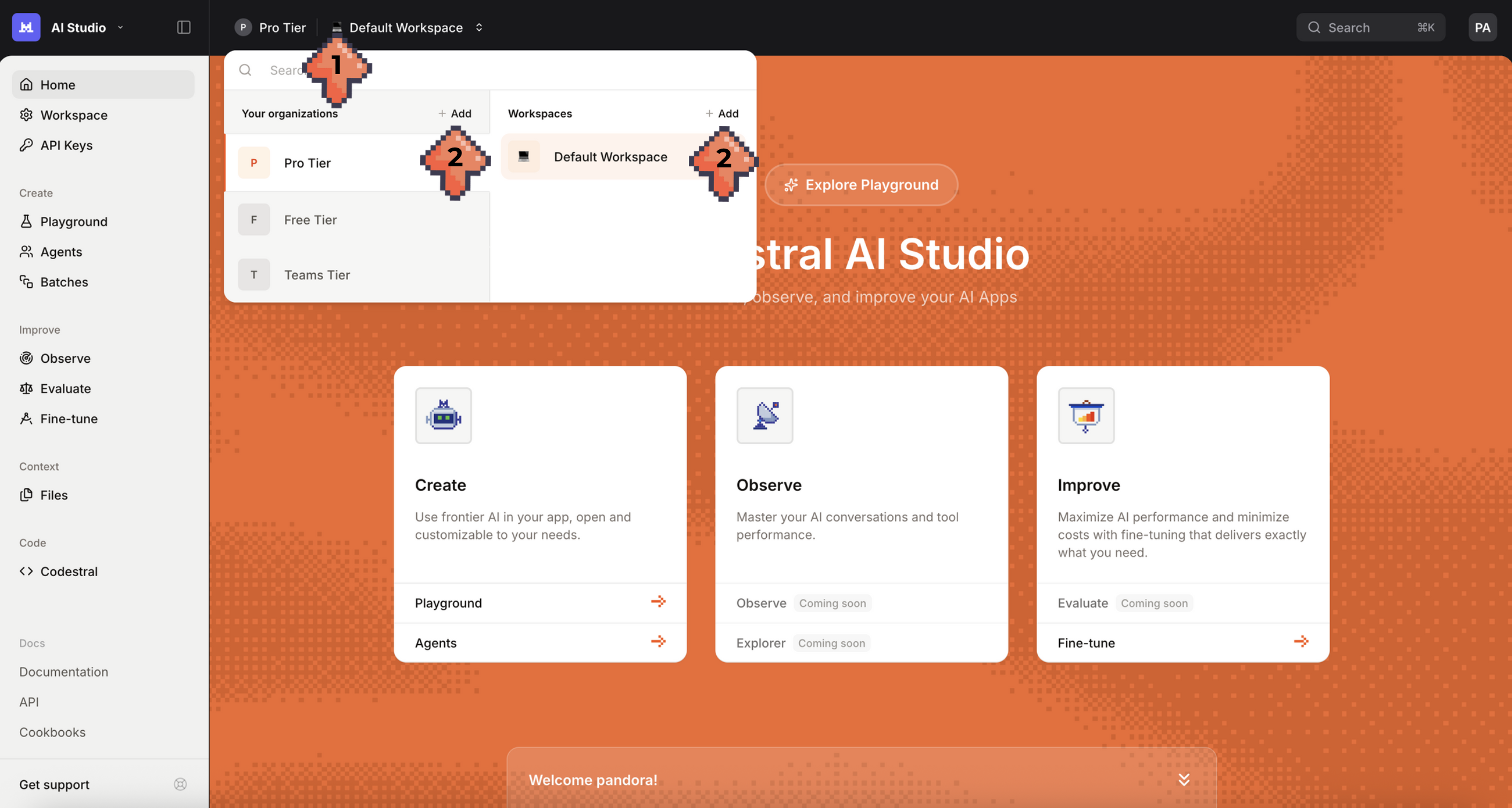 Alternatively, if you are already in AI Studio, click on the top left corner (1) to see your Organizations and Workspaces. You will then be able to view, manage, and create (2) organizations and workspaces.