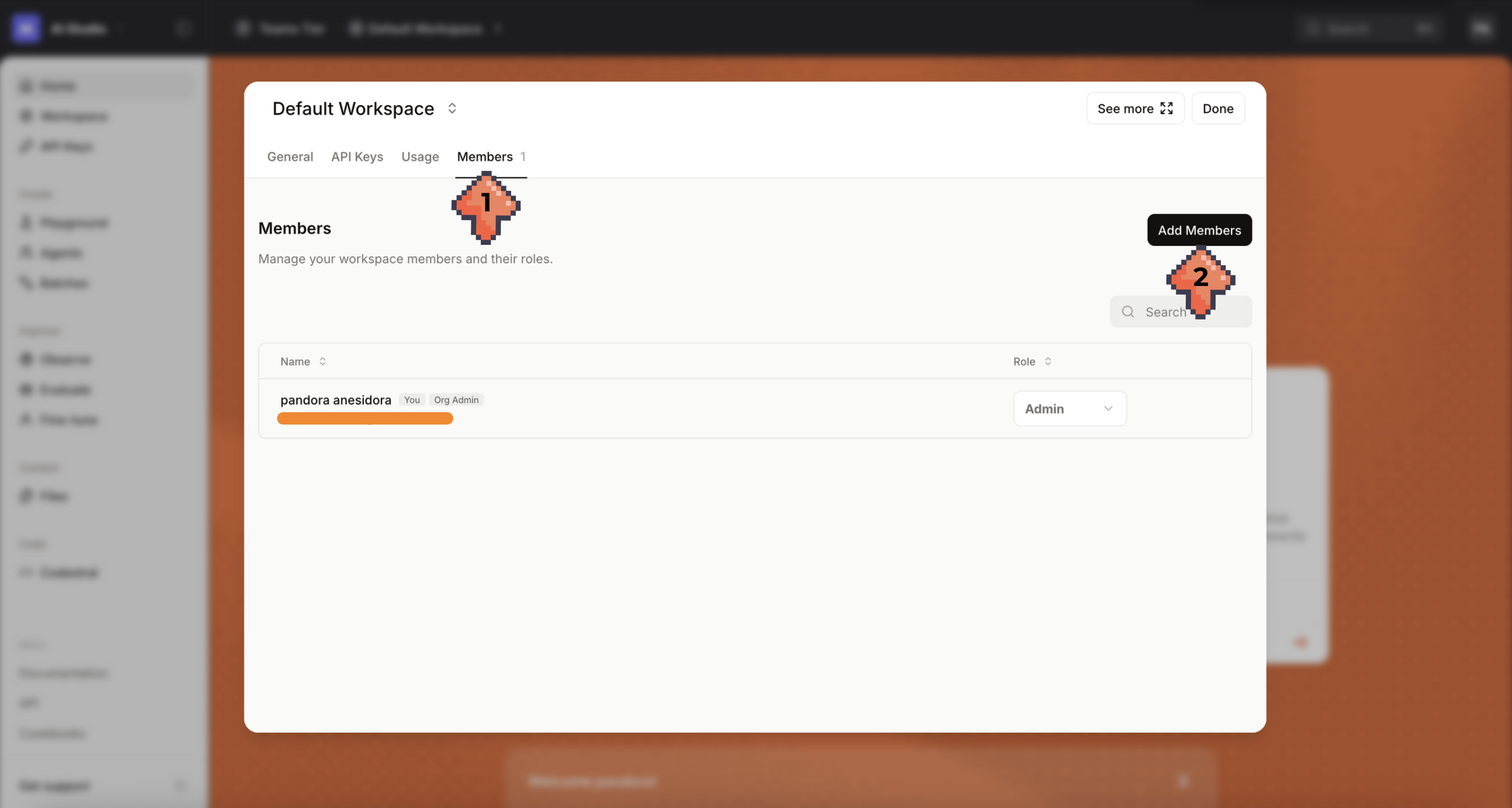 To add a member to a workspace, visit the corresponding Workspace. Under Members (1), click "Add Members" (2).