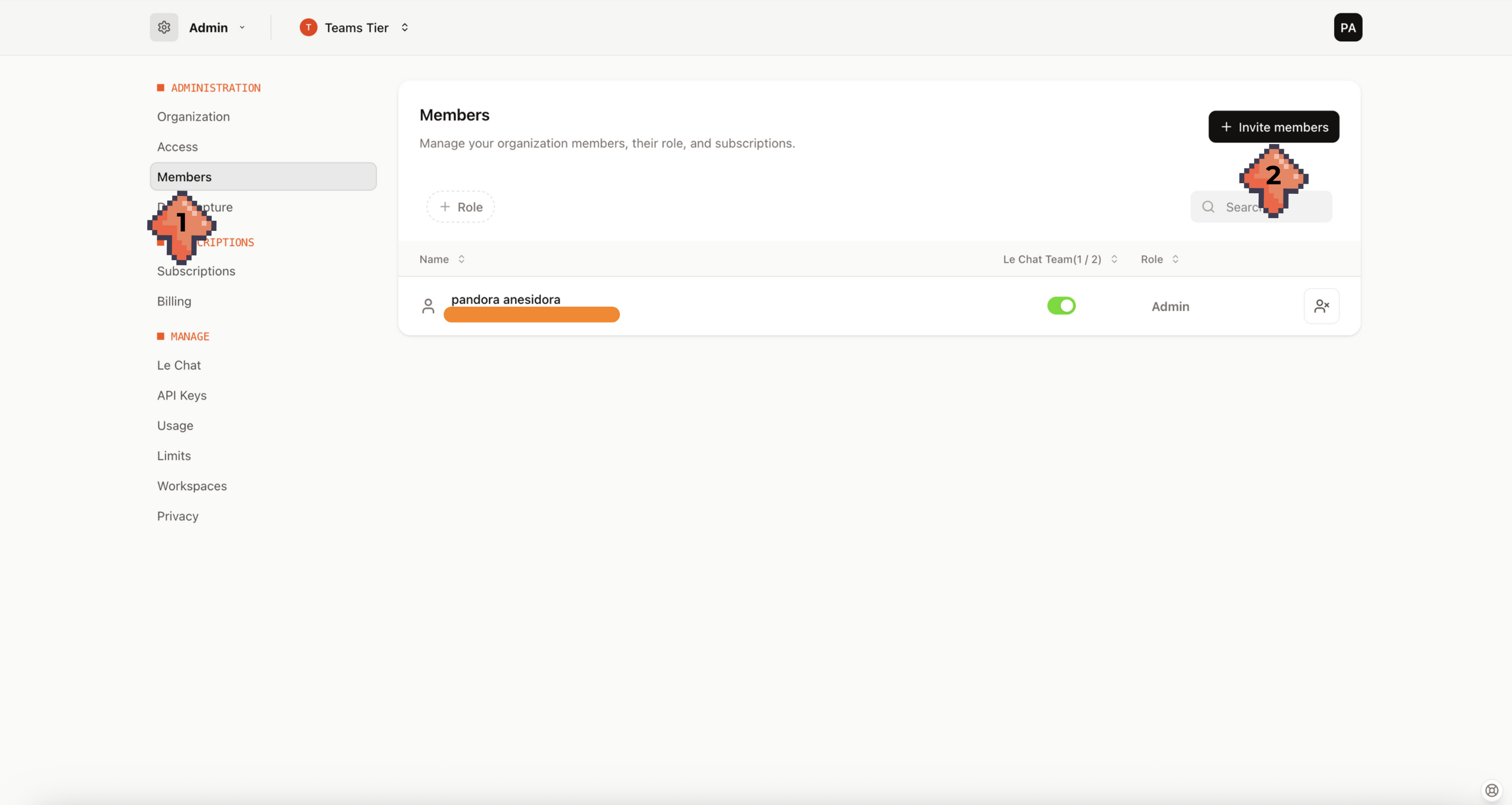 To invite someone to your organization, visit the Admin page. Under Members (1), click "Invite members" (2).